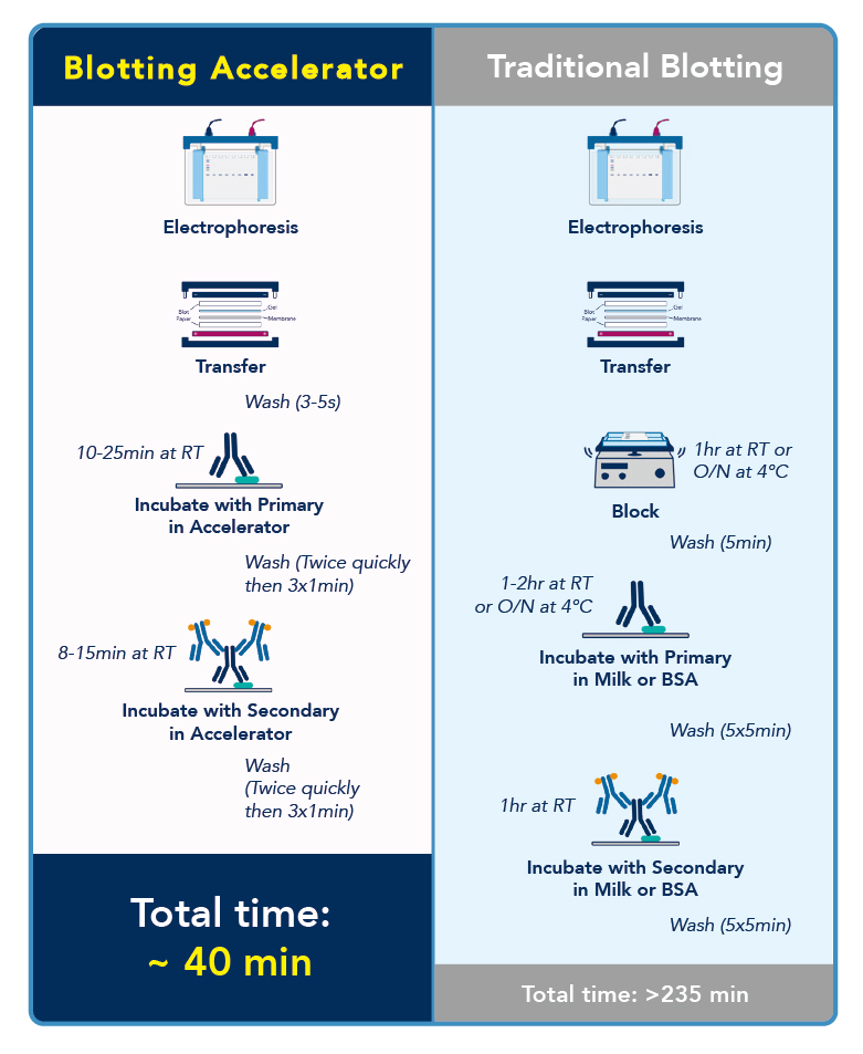 Proteintech 創新推出的 Blotting Accelerator(Cat no : PR20039),只需40min即可完成封閉及抗體孵育,顯著縮短實驗時間;