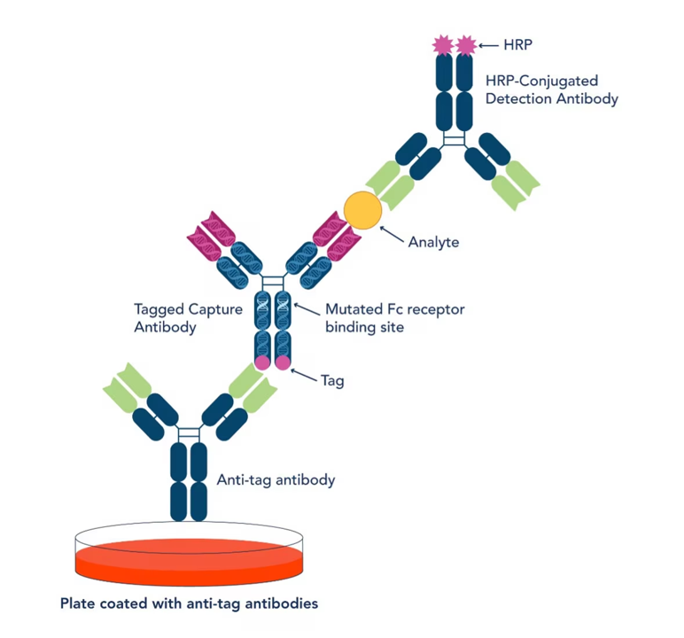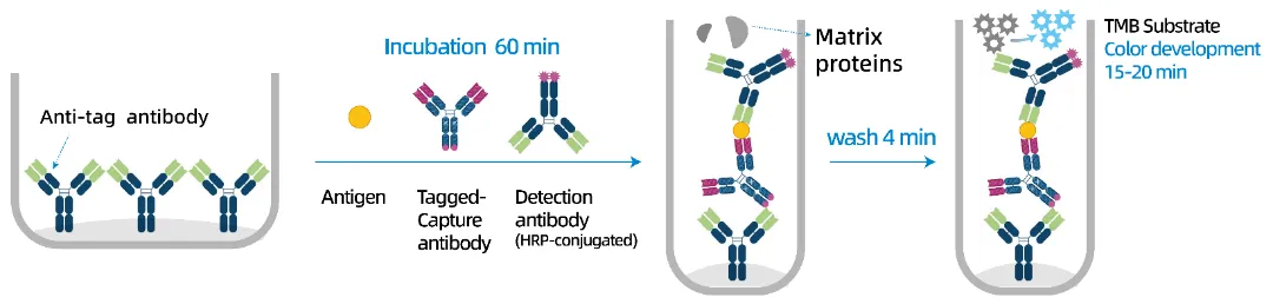 Proteintech Speedy™ One-Step ELISA Kit 多重篩選標籤抗體(Anti-tag antibody),並將它預先固定到ELISA盤上,同時透過基因工程將Tag融合表達到捕獲抗體(Capture Antibody)的Fc末端,透過Fc端的Tag將捕獲抗體(Capture Antibody)和抗標籤抗體(Anti-tag antibody)以及ELISA盤結合起來,代替了傳統ELISA透過物理吸附將捕獲抗體(Capture Antibody)固定到ELISA盤上的方式(見下圖)。