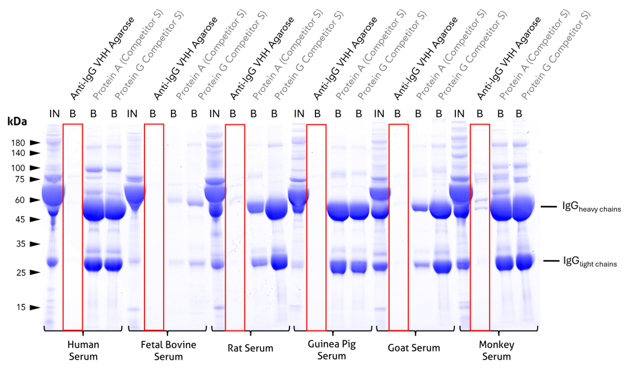 結合了三種高親和力VHH,分別針對rabbit IgG, mouse IgG1 和 mouse kappa light chains。